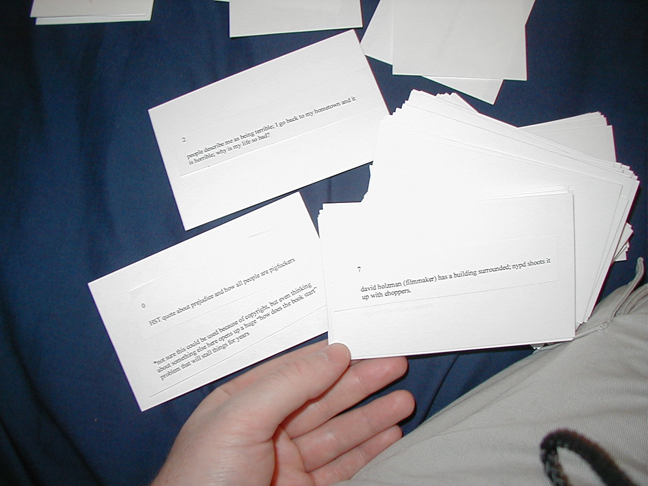 When I wrote Rumored to Exist, I put the entire thing in one file. That made it easier, but it also meant a hell of a lot of scrolling around. It also made it absolutely impossible to do stuff like move around chunks and keep track of what was where unless I printed out every damn page and spread them across every surface of my apartment like I was on some William S. Burroughs kick and about to shoot my wife in the head and write some Serious Nonlinear Fiction. (My apartment did have a lot of bugs, which was a plus.) Around the time I moved to New York, I decided I needed to start over, and put the entire book in a file called rumored-seattle.txt, then opened a blank file and started copying over only the good chunks.