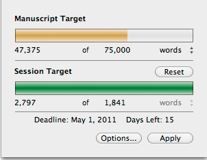 Another big thing for me is statistics. I need to know at any given second how many words are in a project. Whatever you have open in the text editing pane (chapter, fragment, manuscript, whatever) has a word count in the bottom bar. But you can also do a quick Ctrl-Shift-T and get a word count for the project. You can also set a goal date and count, and it will calculate how many words you have to write that day, and pop up a nice little reminder in Growl when you hit your target.