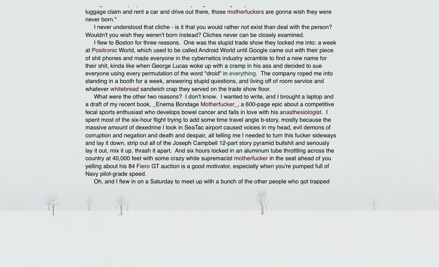 is pretty damn amazing. Basically, you start it, and it opens a text editor over your entire screen, plain and simple. But the little details are what make it so slick. First, it shuts off all notifications. If you’re using Growl to sling popups when you get new mails and whatnot, those all get halted. Next, it draws this background picture of a winter landscape that looks like some lost Tori Amos album back cover. And as you start typing, the borders and minimalist menu buttons fade away. The fonts are very readable and high-design typography too; no more Courier New or whatever the hell emacs uses by default. There’s also a word count tally at the bottom of the resizable text area that will vanish as you get to work. And there’s a choice of several mellow, new-agey ambient soundtracks that play in the background. And all of this sounds hokey, like I’m about to talk to you about an opportunity to resell some healing crystals to your family and friends, but it seriously works. I don’t know why, but it made it much easier to fade into the work. It was awesome for journal entries and articles and brief bursts of automatic writing. But it was not a full-fledged content management system; there’s no way I could write a book in this thing.