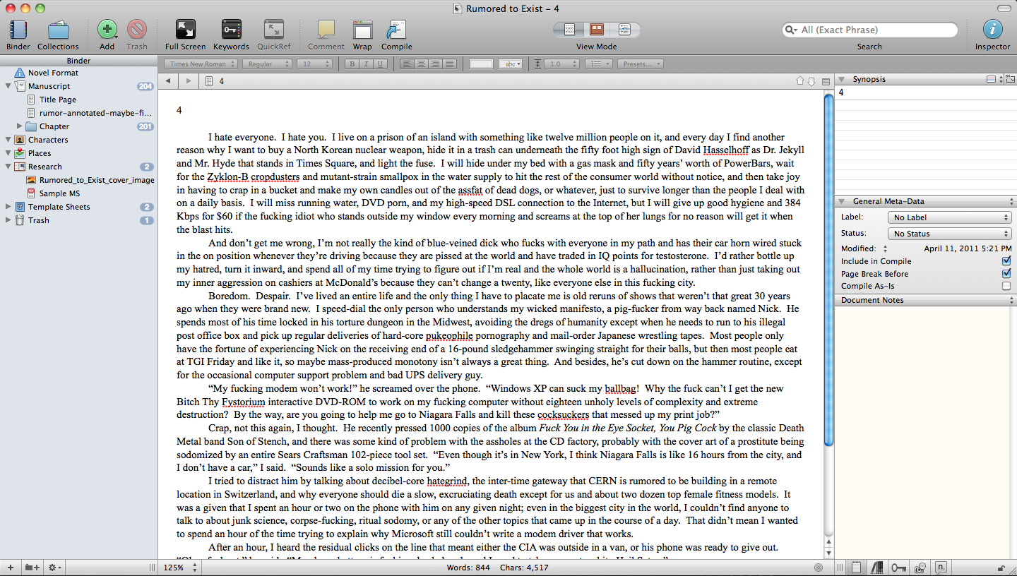 Scrivener is a lot like modern IDEs you’d use to write code: there’s a binder that’s a project-level collection of folders, with one folder being the actual manuscript, and the other folders being whatever the hell you want. In a folder, you can create other folders, or you can create documents. So let’s say my manuscript has a dozen chapters, I can make each of those a folder. Then in each folder, I can have a bunch of text documents, one for each scene or paragraph or whatever the hell I want. I can drag those around in any order, chop them into smaller pieces, merge them, add more, delete them, whatever. Then when I click on my chapter folder in the left navigation pane, I’m presented with every piece in that folder, all glued together into one document. Click at the root level, in the manuscript folder, and you’ve got your entire book. It makes it very easy to write in fragments, and move things around easily. This is pure magic for me. I really wish I had a program like this when I wrote Rumored to Exist – it would have saved me at least a year of time.