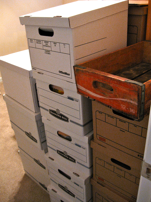 Since graduating high school, I’ve moved 15 times, with four of those being cross-country or across a good chunk of the country. Each time, my collection of various memorabilia gets compressed and rehashed, and I change my mind about just how important it is to keep zines I haven’t read since 1994 or printouts of rough drafts of books I’ve long ago published. But from each era, some pieces still remain, and when I shift through these boxes and bins, there’s a pattern, like an archaeologist digging through layers of an old swamp to find fossils of a certain epoch. I used to keep these crates in a closet or spare room, but when we moved to this open plan loft condo, I don’t have an area for this crap, which is why I rented the storage unit.