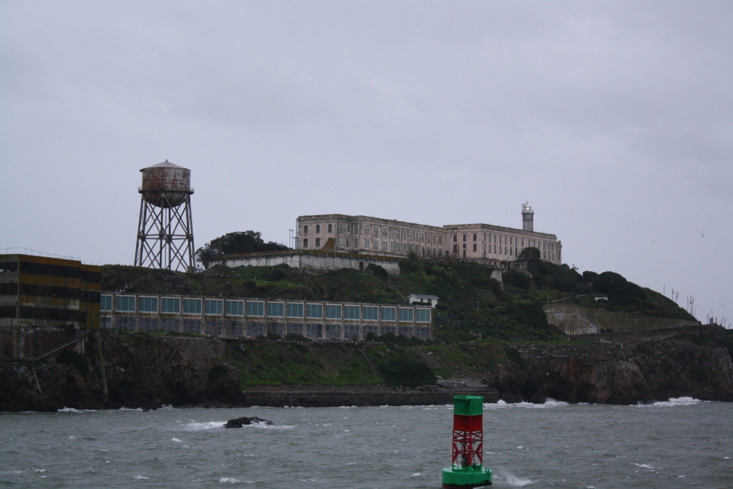 Last night, we took the night tour at Alcatraz. The night tour is the best time to go; it leaves the dock at about 6:45, and they have more tour guides there, plus you get to see everything at night, or when the sun’s setting, which lends to some amazing views. Unfortunately, we went during some horrible weather. It was like 47 degrees, pouring rain, and extremely windy, and it got even worse when we were on this little clump of rock in the middle of the bay. It’s hard to get tickets to the night tour, and we ordered ours months ago, so we bundled up and decided to power through it and go anyway.