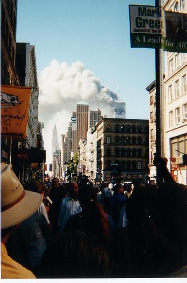 The news makes it look like it’s mt st helens with all of the raining ash, but it’s not that bad unless you are right on wall street. I just bought two disposable cameras and walked to maybe 10 blocks north. I saw the second tower on fire, and it was one of the most bizarre things I’ve seen in my life. Right after I took pictures, it collapsed, but I didn’t see it happen because of the smoke.