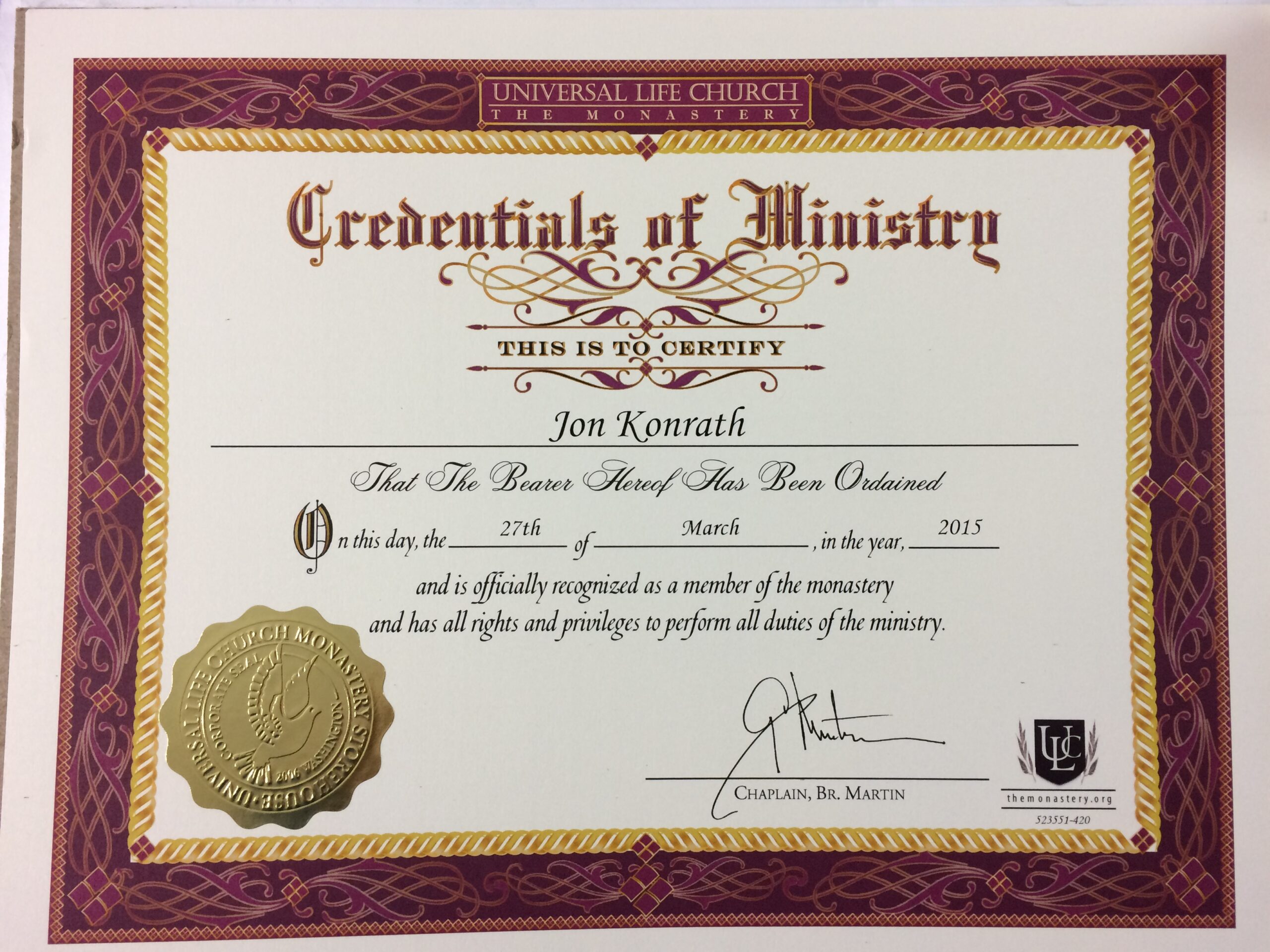 In addition to being a world-famous fiction writer, cough syrup enthusiast, and inventor of the zero-g bong, did you know I, Jon Konrath, am an ordained minister?