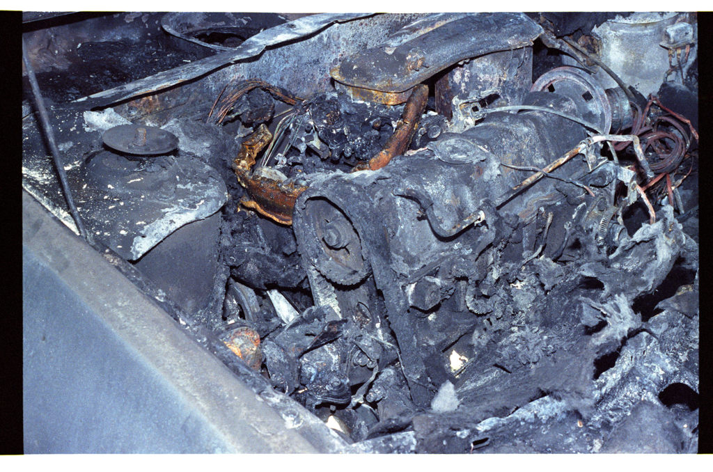 By this time, the car looked like a plane crash, billowing a column of black smoke into the air. I heard sirens, which is always ominous when you realize the sirens are for you. A cop, parked a dozen yards away, told me to wait in his car, and tried to clear everyone away, anticipating an explosion. From the cop car, I saw flames through the firewall of the passenger compartment, consuming the interior. The firefighters, dressed in full turnout gear, worked fast. They closed the doors, smashed the windows with axes, and dumped a swimming pool full of water into the engine compartment and interior. Becky and my sister were at the grocery store, and came over to look at the idiot with the burning car and then saw it was me. I wish I would have told one of them to run in, get a disposable camera, and take a picture of the disaster.