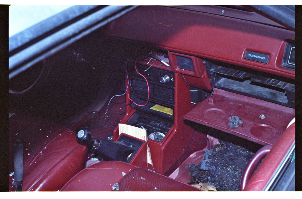 The next morning, I took these pictures, with Becky’s 35mm. I have no idea what caused the fire, but the engine had actually melted, it got so hot. The interior was drenched, coated with soot and the carpet melted and burned, peppered with pieces of the greenish shattered safety glass everywhere. I actually got the aforementioned junkyard to buy the whole mess for $50, and within a week or two, got a diesel VW Rabbit for $500. Finished the semester with a 0.67 GPA, broke up with Becky, spent a summer working second shift and then taking 8 AM summer school classes, and managed to get the hell out of town and back to Bloomington that fall.